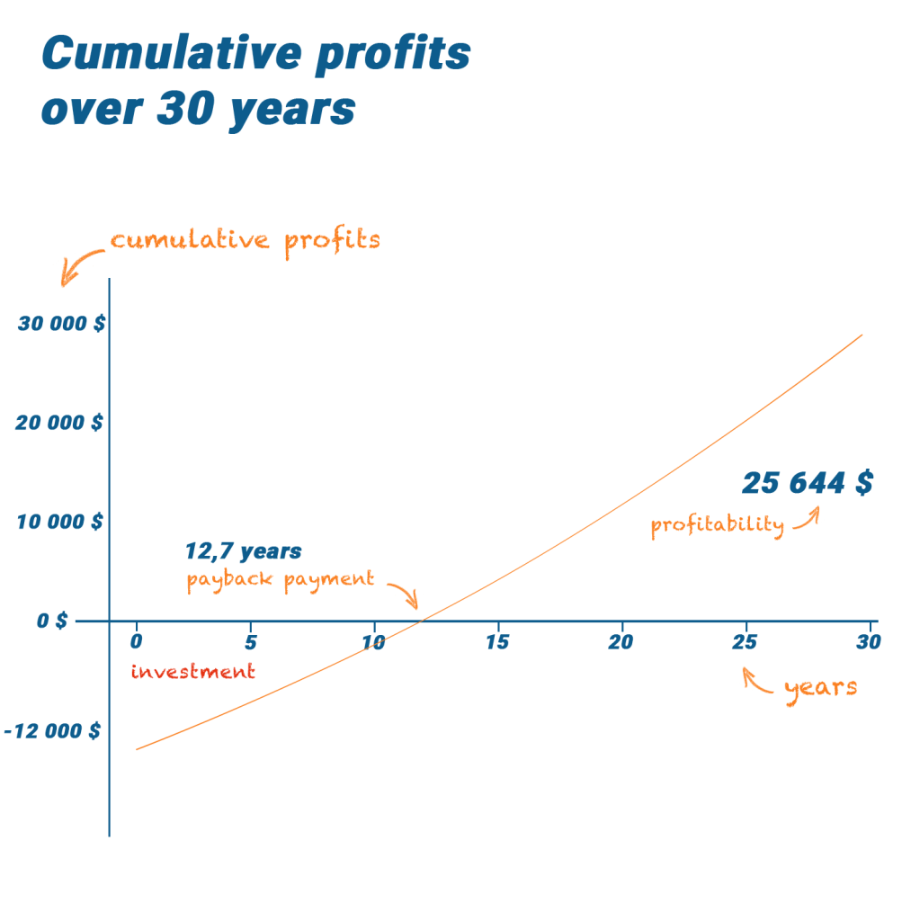 Robert will be able to save approximately $764 on his electricity bill, with an estimated growth of 4% per year. The payback period will be approximately 12.7 years. Over a 30-year period (the warranty period for most solar panels), cumulative profits could reach approximately $25,664, as illustrated in the graph below, for a return on investment (ROI) of 7.7%, while protecting Robert from rising electricity rates.