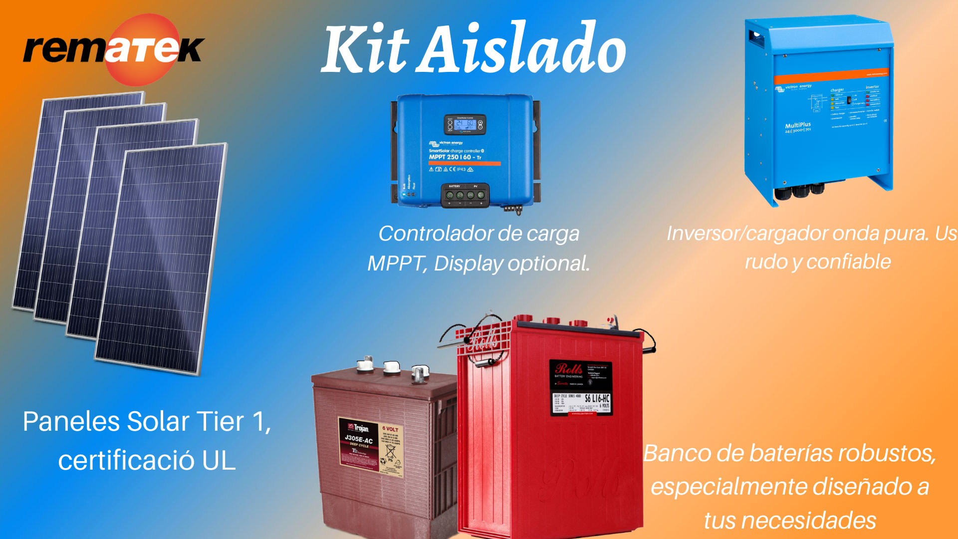 - Banco de baterías ácido de plomo ciclado profundo con capacidad de 3 211 wh, marca Rolls