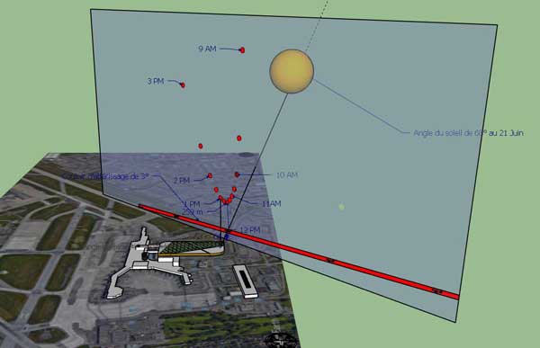 Thanks to our in-depth analysis of the reflective rays coming from the solar panels at any time of day throughout the year, we were able to demonstrate to the customer that they could go ahead with the project, since there would be no danger to either pilots or air traffic controllers. This analysis was carried out for departures and landings in both directions for all runways.